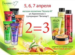 Только три дня – 5, 6, 7 апреля – при покупке любых двух средств серий Nice Selfie и «Фруктовый десерт» третье Вы получаете в подарок!* Акция проходит в магазине косметики «Белита-М», ул. Каролинская 5 (супермаркет «Виталюр», павильон 3)...
